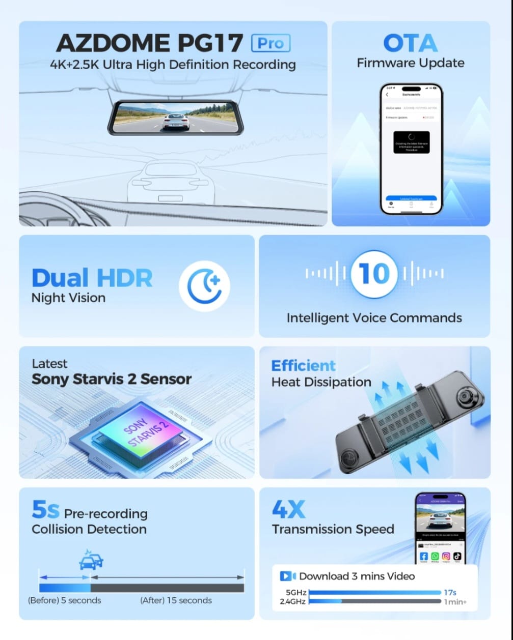 احصل على راحة البال أثناء القيادة مع داش كام المرآة الذكية من AZDOME، بدقة تصوير 4K أمامي و2.5K خلفي لضمان وضوح كامل في كل لحظة، مع تقنية رؤية ليلية محسّنة، وتحكم صوتي ذكي، وتسجيل تلقائي مستمر، بالإضافة إلى Wi-Fi 6 لمشاركة المقاطع بسرعة وGPS مدمج لتتبع مسار القيادة بدقة في الوقت الحقيقي.